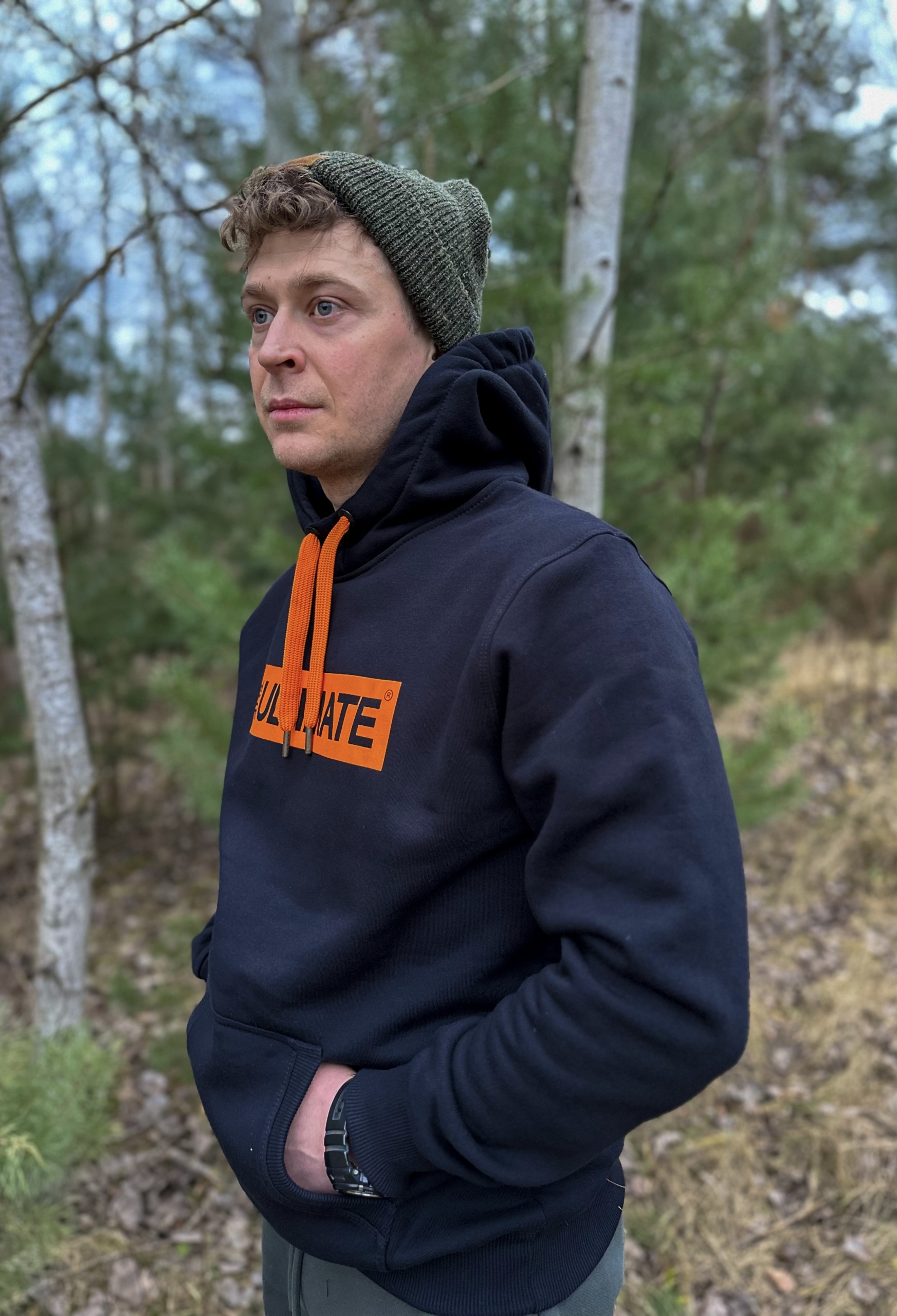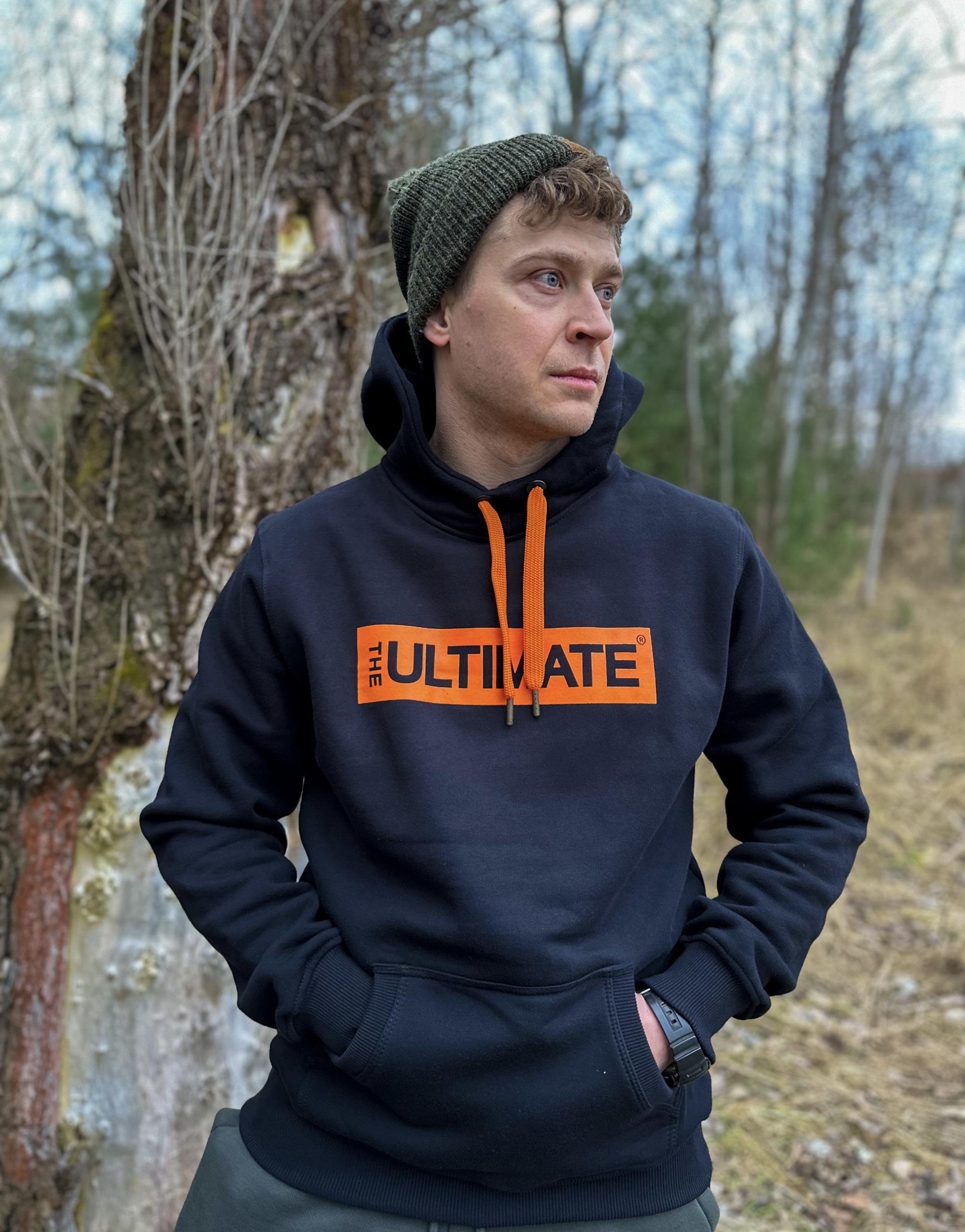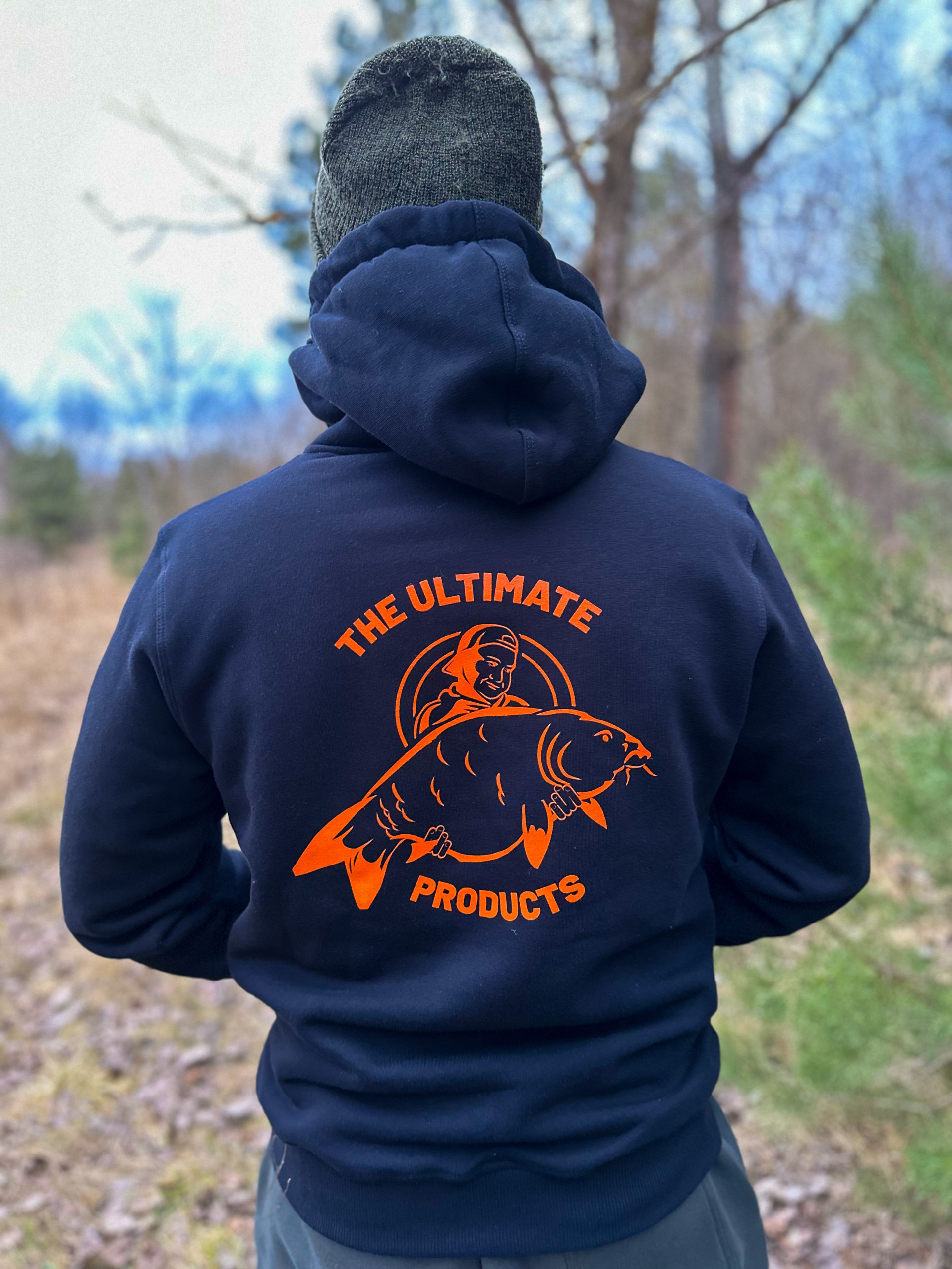 Najbardziej klasyczna i uniwersalna Bluza w kolorze czarnym, z napisem The Ultimate w kolorze pomarańczowym, pojemną kieszenią i ozdobnymi sznurkami regulującymi kaptur.
